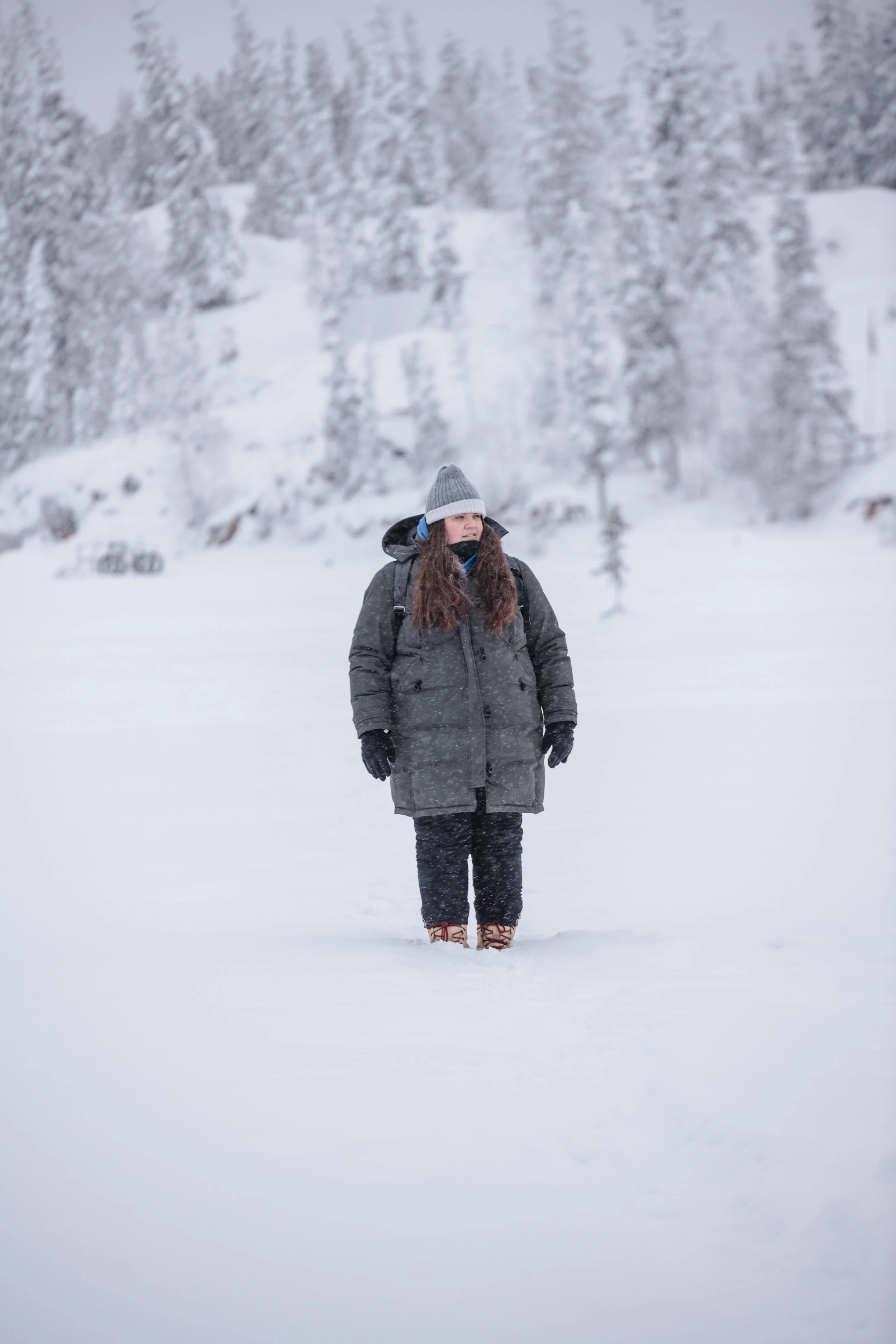 Kaila stands on an ice road in a mustard yellow coloured long jacket with her hands in her pockets.
